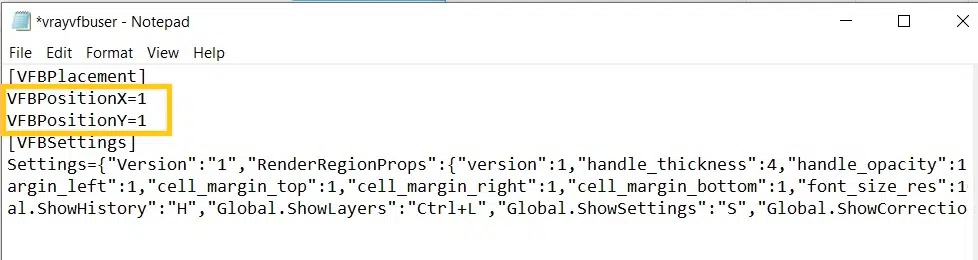 سپس فایل vrayvfbuser را باز کنید. در پنجره باز شده موقعیت x و y را روی 1 قرار دهید و سیو کنید. در نهایت تنظیمات مکس را به حالت پیش فرض برگردانید.