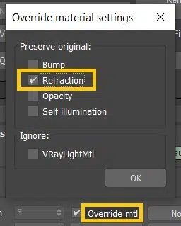 - یکی دیگر از اشتباهات رایج در سیاه شدن رندر این است که زمانی که حالت override را فعال میکنیم تیک refract را فعال نمیکنیم و نور وارد صحنه نمیشود. برای حل این مشکل یکبار روی override mtl کلیک کنید و تیک refraction را فعال کنید.