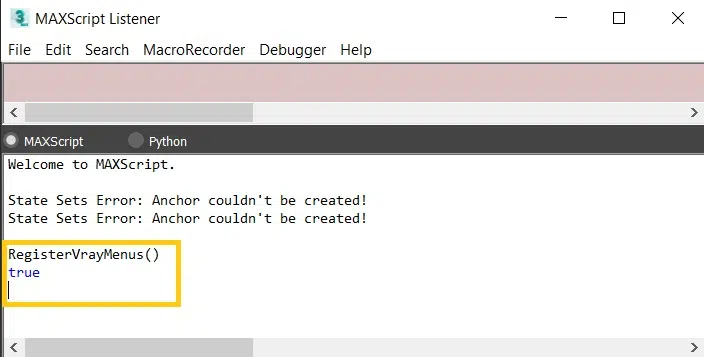 - دکمه f11 را فشار دهید و در پنجره باز شده عبارات زیر را تایپ کنید و اینتر را بزنید. ()RegisterVrayMenus