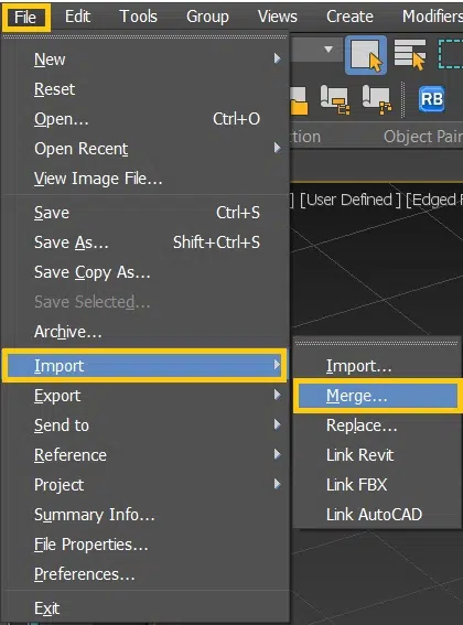 - سپس از قسمت file روی گزینه import کلیک کنید و merge را بزنید و فایل پروژه خود را که قبلا سیو کرده بودید مثل یک آبجکت در صحنه جدید merge کنید.