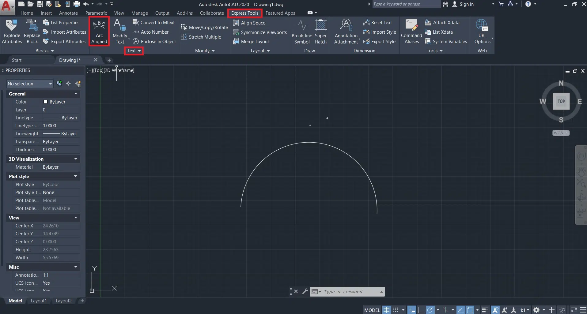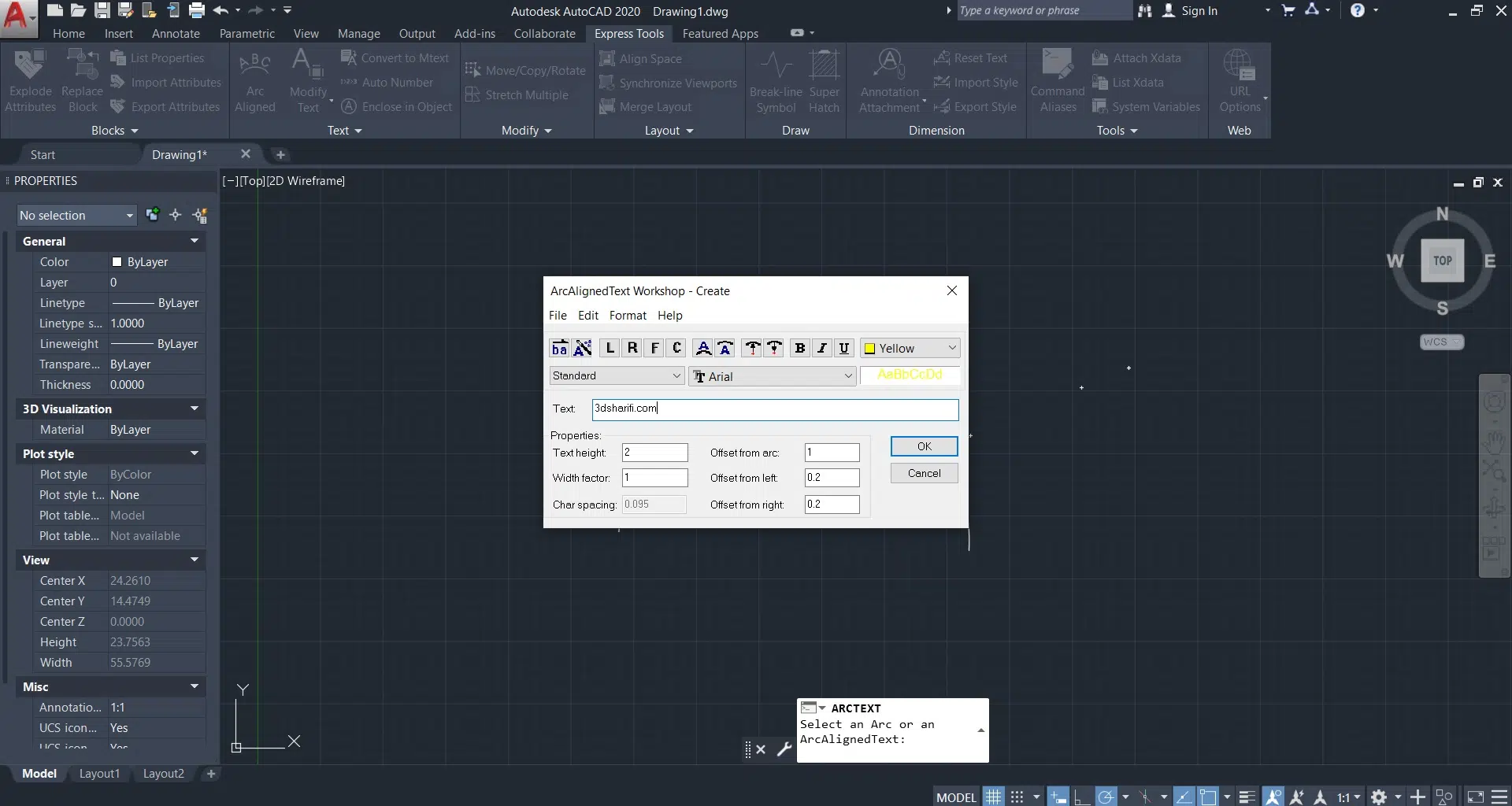 برای فعال کردن این دستور در نوار ابزار بالا در سربرگ Express Tools و زیر مجموعه text گزینه Arch Aligned را انتخاب میکنیم و یا Arctext را تایپ میکنیم و اینتر را میزنیم. بعد از فعال شدن دستور کمان مورد نظر را انتخاب میکنیم.