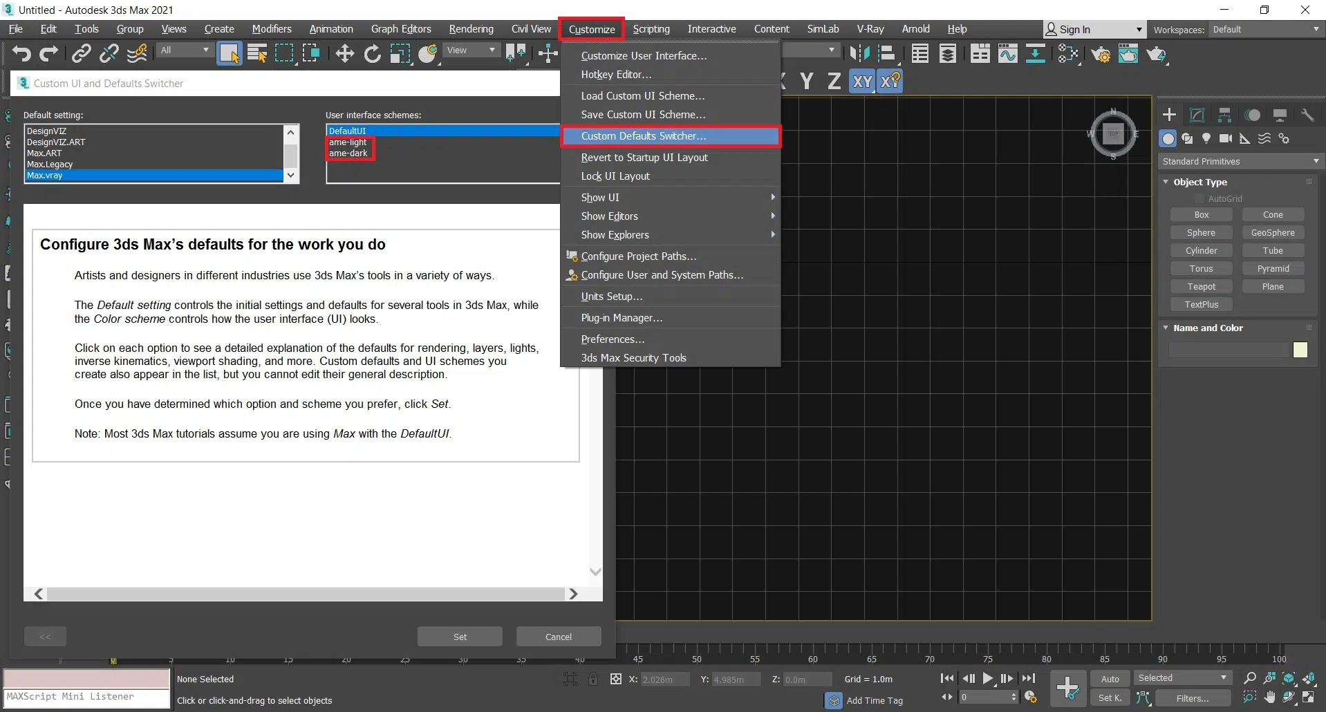 از منوی Customize گزینه Custom Defaults Switcher را انتخاب کنید. سپس در پنجره باز شده که ازقسمت UI Schemes میتوانید light یا dark را انتخاب کنید و سپس روی Set کلیک کنید و یک بار تری دی مکس را بسته و باز کنید تا تغییرات اعمال شود.