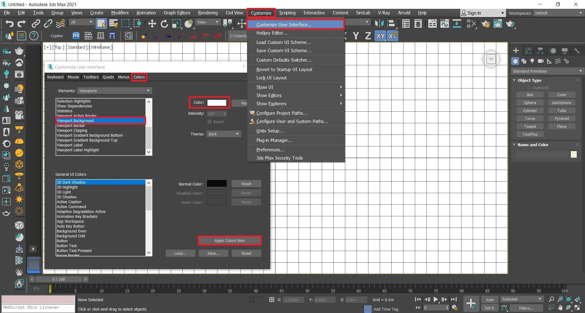 برای این کار در نوار ابزار بالا روی منوی customize کلیک کرده و گزینه customize interface را انتخاب کنید. پس از باز شدن پنجره وارد قسمت Colors شوید و با انتخاب گزینه viewport background رنگ مورد نظر را از قسمت Color انتخاب کنید و با کلیک روی گزینه Apply Colors now و بستن پنجره customize interface، تغییرات روی قسمتviewport اعمال میشود.