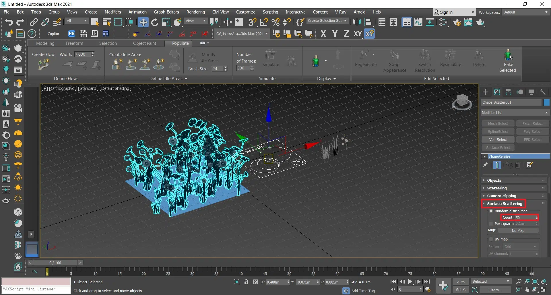 برای انتخاب تعداد کپی از آبجکت های انتخاب شده در سربرگ surface scattering عدد count را روی تعداد مورد نظر تنظیم کنید.
