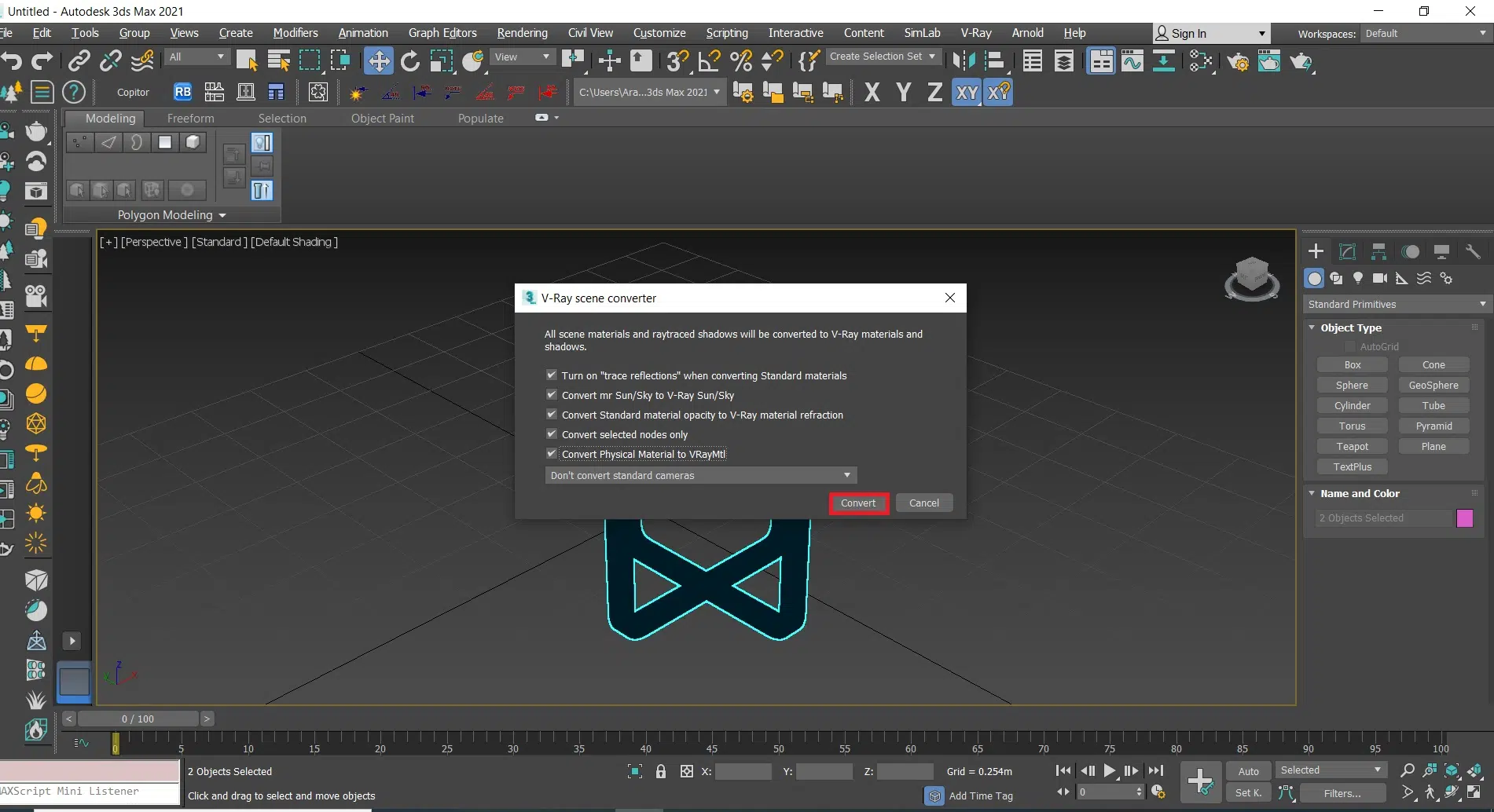 پنجره جدید برای شما باز میشود که در آن تیک همه گزینه ها را فعال کنید و بعد از زدن گزینه convert بعد از طی شدن مراحل تمام متریال های آبجکت از کرونا به ویری تبدیل میشود.