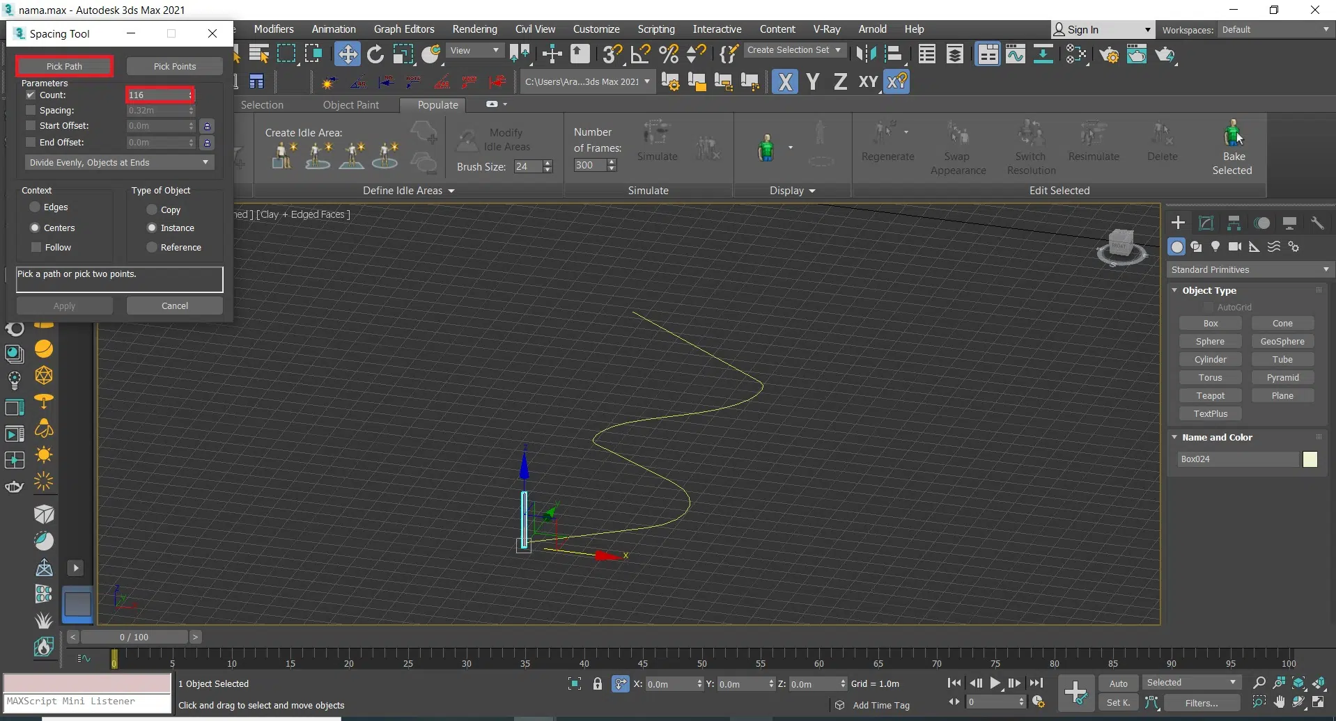 در پنجره باز شده گزینه pick path را انتخاب میکنیم و روی مسیر مورد نظر کلیک میکنیم. سپس به کمک قسمت count تعداد کپی را مشخص میکنیم.