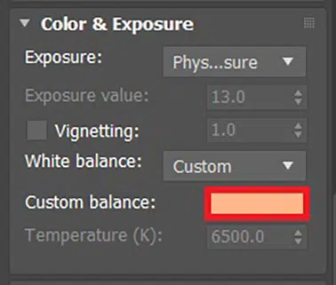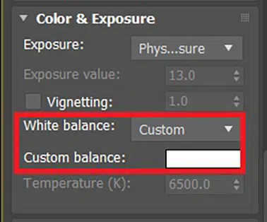 پارامتر white balance در سربرگ color & exposure برای تنظیم رنگ نور صحنه به ما کمک میکنید که معمولا در حالت custom و رنگ سفید نتیجه خوبی به ما میدهد.