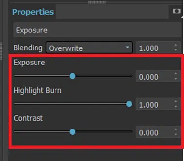 از صحنه رندر میگیریم و بعد از اتمام رندر در فریم بافر در قسمت layers گزینه exposure را انتخاب میکنیم و میتوانیم به کمک پارامتر های آن میزان روشنایی و سوختگی و کنتراست را تغییر دهیم تا به نتیجه مناسب برسیم.