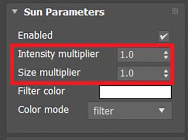 در تنظیمات vraysun به کمک intensity multiplier میتوانیم شدت نور را تنظیم کنیم و با size multiplier سایز آن را تنظیم میکنیم که هرچه سایز بزرگتر باشد لبه سایه ها محو تر میشود. این پارامتر ها را باید طوری تنظیم کنیم که به یک بالانس مناسب برسیم.