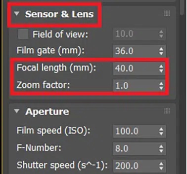 برای تنظیم دوربین با انتخاب آن میتوانیم در نوار ابزار پایین ارتفاع را به کمک y تنظیم کنیم و با انتخاب target میتوانیم هدف را مشخص کنیم. در تنظیمات آن به کمک focal length و zoom factor در سربرگ sensor & lens میتوانیم زوم کنیم.