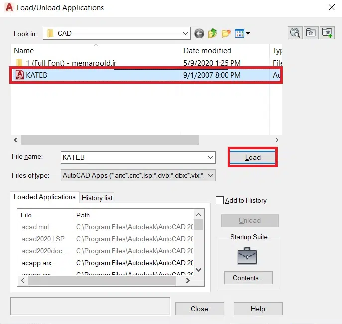 در ادامه نصب فونت فارسی در اتوکد، عبارت Appload را در اتوکد تایپ میکنیم و در پنجره باز شده kateb را انتخاب میکنیم و گزینه load را میزنیم. حال کاتب برای ما نصب شد و با تایپ کردن kateb میتوانیم آن را اجرا کنیم.