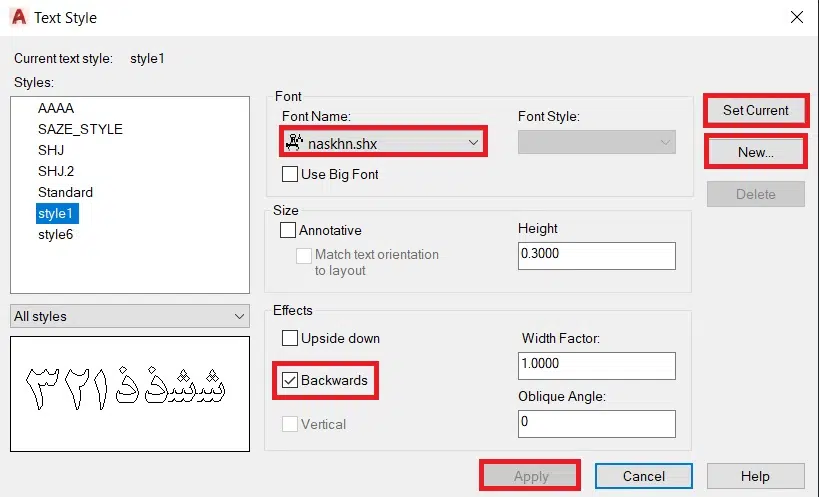 حال style رو تایپ میکنیم و با زدن space پنجره ای برامون باز میشه که در آن به کمک new یک فونت جدید میسازیم و در قسمت font فونت مورد نظر را با پسوند SHX انتخاب میکنیم. حتما گزینه Backward را فعال کنید تا جهت نوشته درست باشد و در نهایت روی Apply کلیک کنید تا تغییرات اعمال شود. حتما فونت را روی حالت set current قرار بدین.