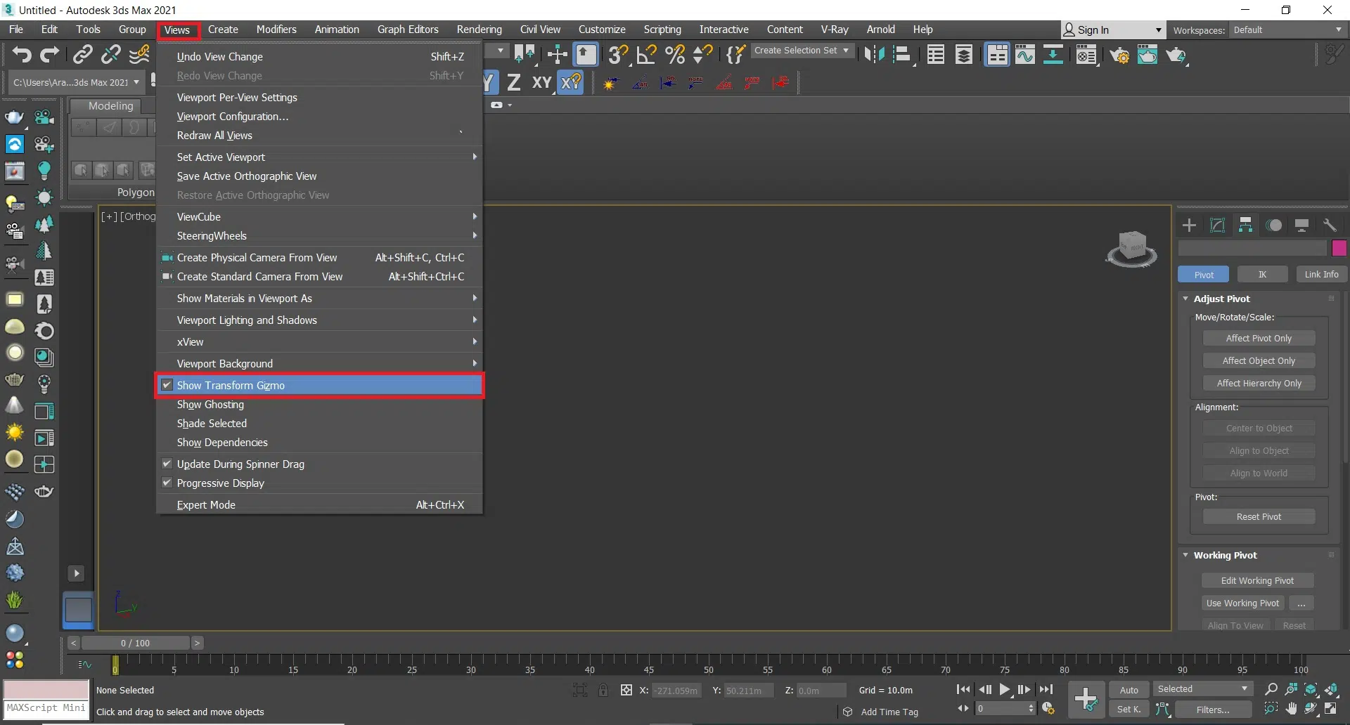 برای فعال کردن gizmo کافی است در نوار ابزار بالا در سربرگ view تیک show transform gizmo را فعال کنید تا بتوانید از آن استفاده کنید.