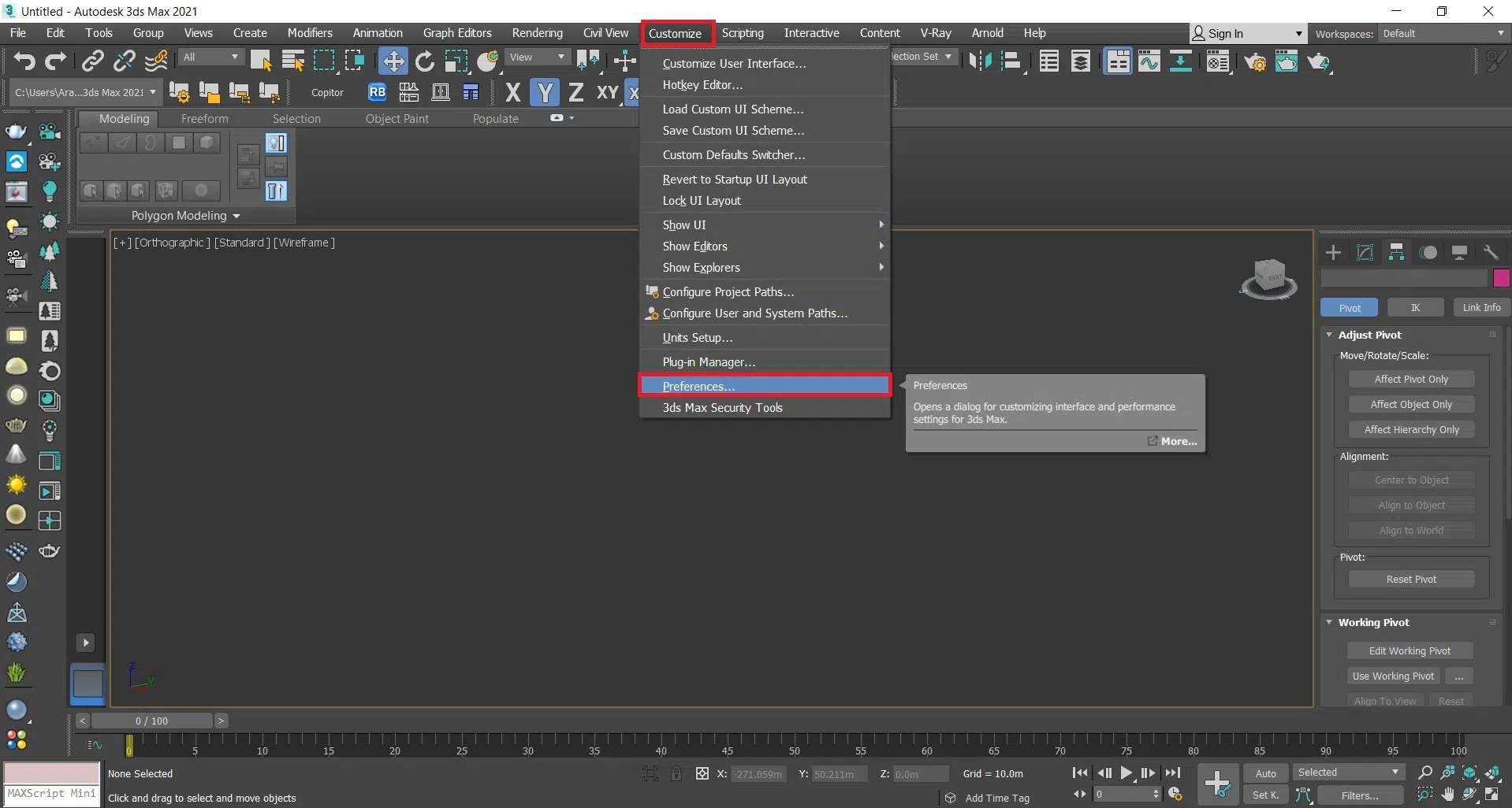 برای دسترسی به تنظیمات gizmo باید در نوار ابزار بالا روی منوی customize کلیک کنید و گزینه preference را انتخاب کنید. سپس در پنجره باز شده روی سربرگ gizmo کلیک کنید تا وارد تنظیمات آن شوید.