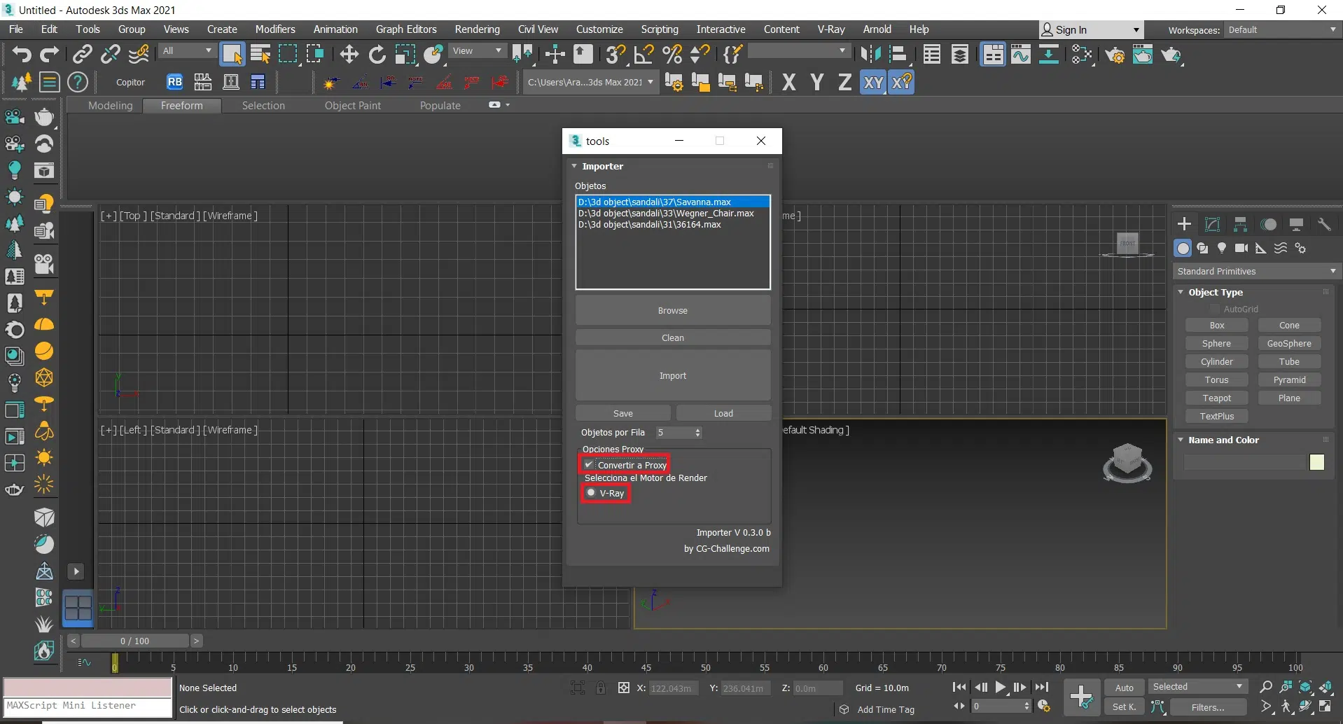 یکی از قابلیت های جذاب این اسکریپت امکان پروکسی کردن آبجکت های سنگین قبل از ورود به صحنه است. برای این کار کافی است آبجکت های مورد نظر را انتخاب کنید و قبل از زدن گزینه import تیک convertir a proxy را فعال کنید و موتور رندر مورد نظر را انتخاب کنید.