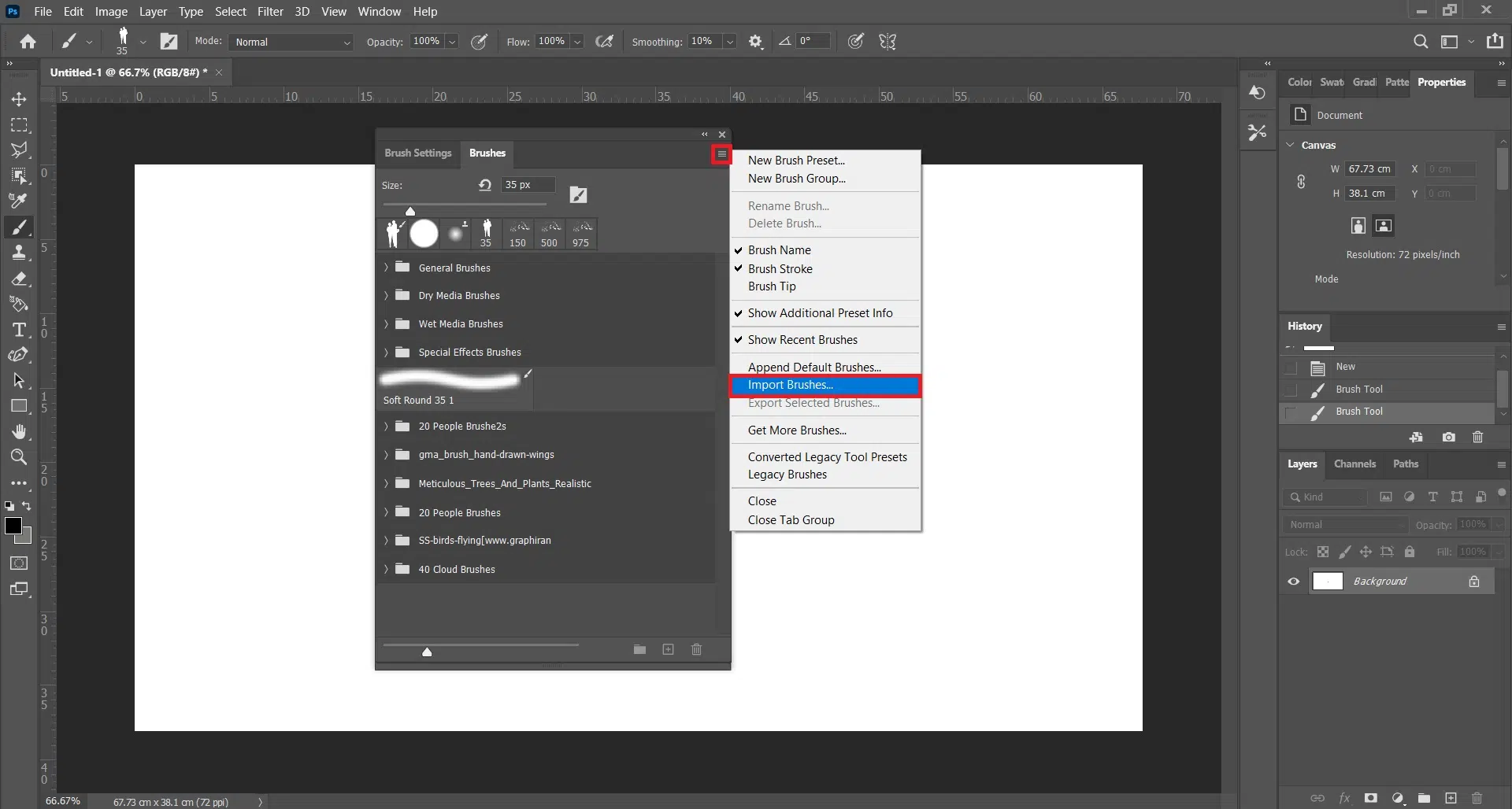 سپس در پنجره باز شده روی سه خط بالا سمت راست کلیک کنید و به کمک گزینه import brush میتوانید براش مورد نظر خود را وارد فتوشاپ کنید.