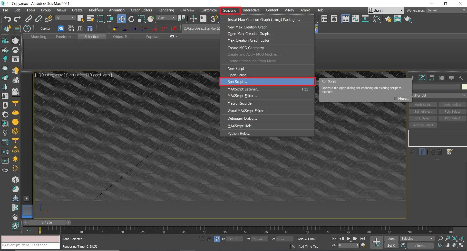 این دو فرمت به صورت دائمی قابل نصب نیستد و باید در هر بار استفاده از تری دی مکس در صورت نیاز به آن از روش run script و یا درگ کردن آن در صحنه آن را اجرا کنید. برای فرمت های ms یک روش وجود دارد تا بتوانید آن را به نوا ابزار بالا اضافه کنید. برای این کار باید در منوی scripting گزینه open script را انتخاب کنید و اسکریپت را باز کنید. سپس در پنجره ای که باز میشود کد ها را به کمک ctrl + a انتخاب کنید و در نوار بالا درگ کنید تا یک ایکون برای شما ایجاد شود.
