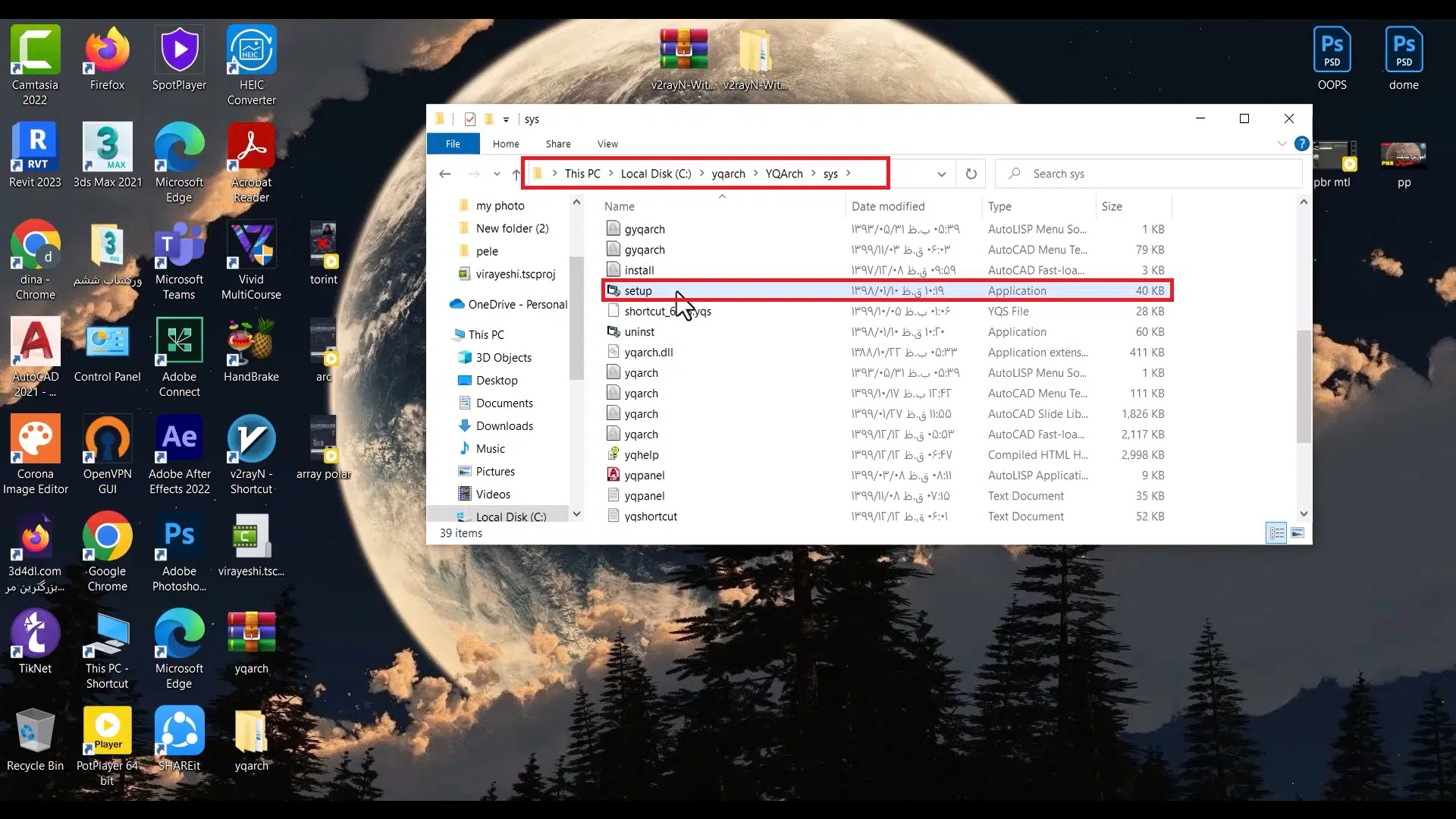 برای نصب پلاگین YQArch ابتدا فایل دانلود شده را از حالت فشرده خارج میکنیم و پوشه ی موجود در آن را در درایوی که اتوکد را در آن نصب کردیم باز میکنیم. سپس پوشه مورد نظر را باز میکنیم و فایل setup را پیدا میکنیم.