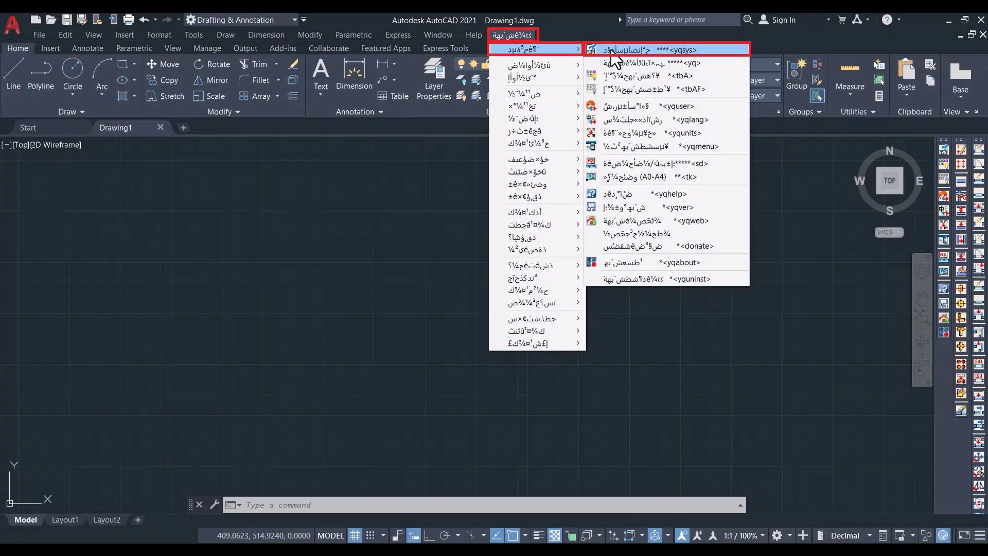 در ادامه نصب پلاگین YQArch، برای تغییر زبان در نوار ابزار بالا گزینه پلاگین را که با زبانی نامفهوم ایجاد شده باز میکنیم و گزینه اول را انتخاب میکنیم و مجدد گزینه اول را انتخاب میکنیم.