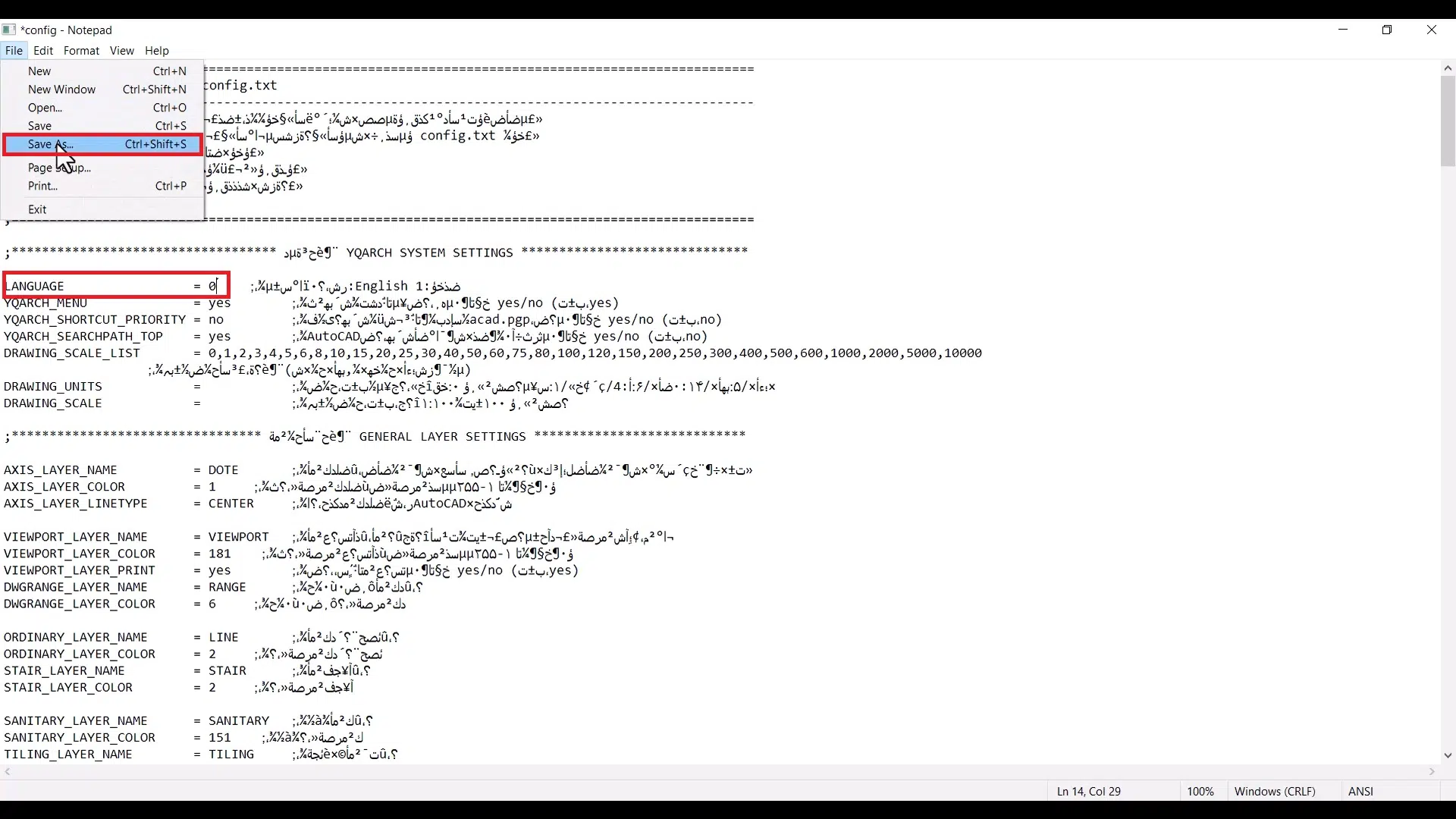در پنجره ای که باز میشود عدد language را روی صفر قرار میدهیم و در نوار ابزار بالا و قسمت file روی گزینه save as کلیک میکنیم و ذخیره میکنیم.
