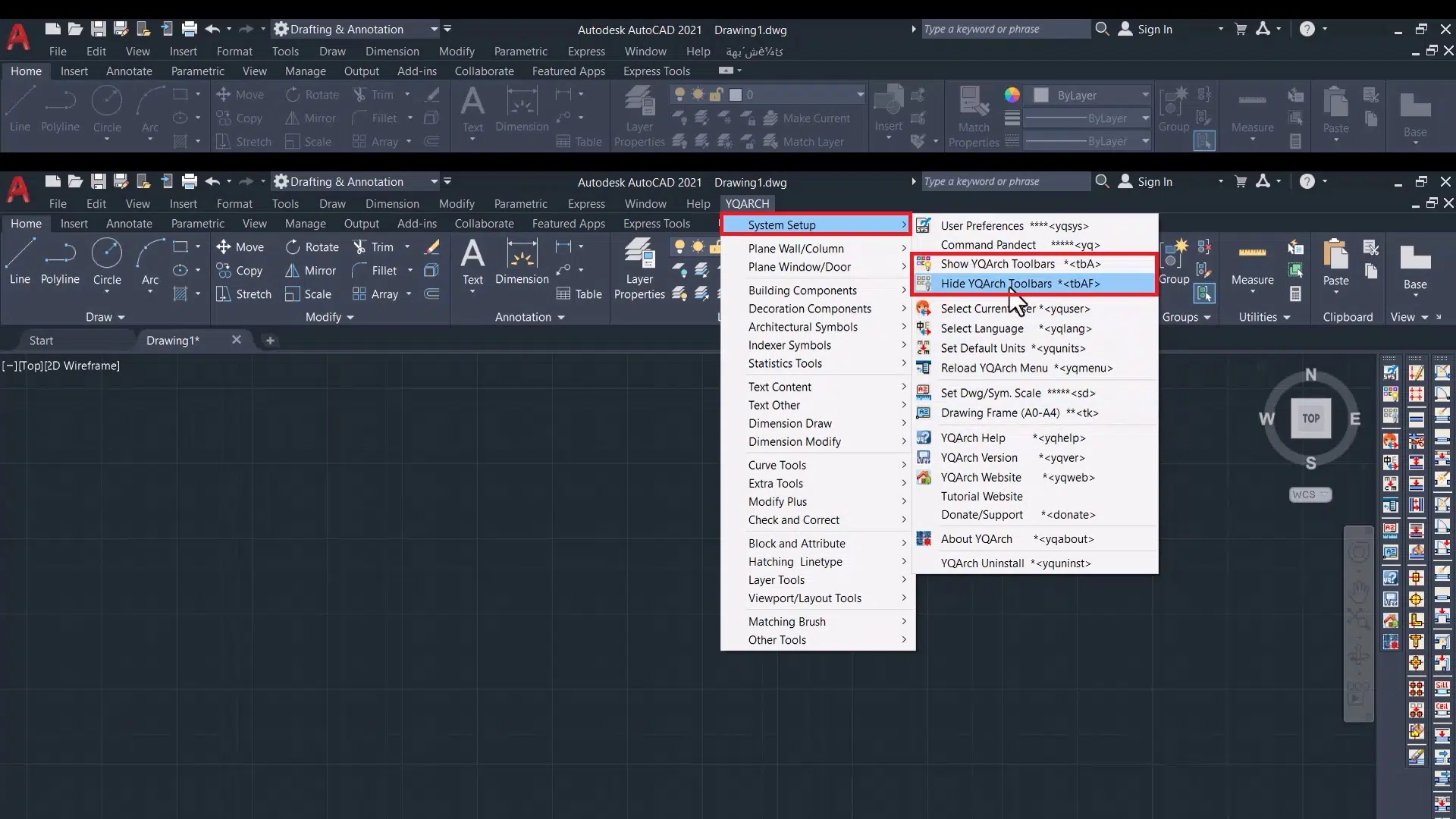 شما میتوانید در قسمت system setup به کمک گزینه های hide YQArch toolbar و show YQArch toolbar آیکون های این پلاگین را خاموش و روشن کنید.