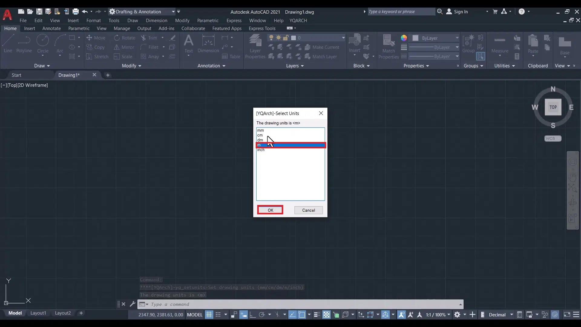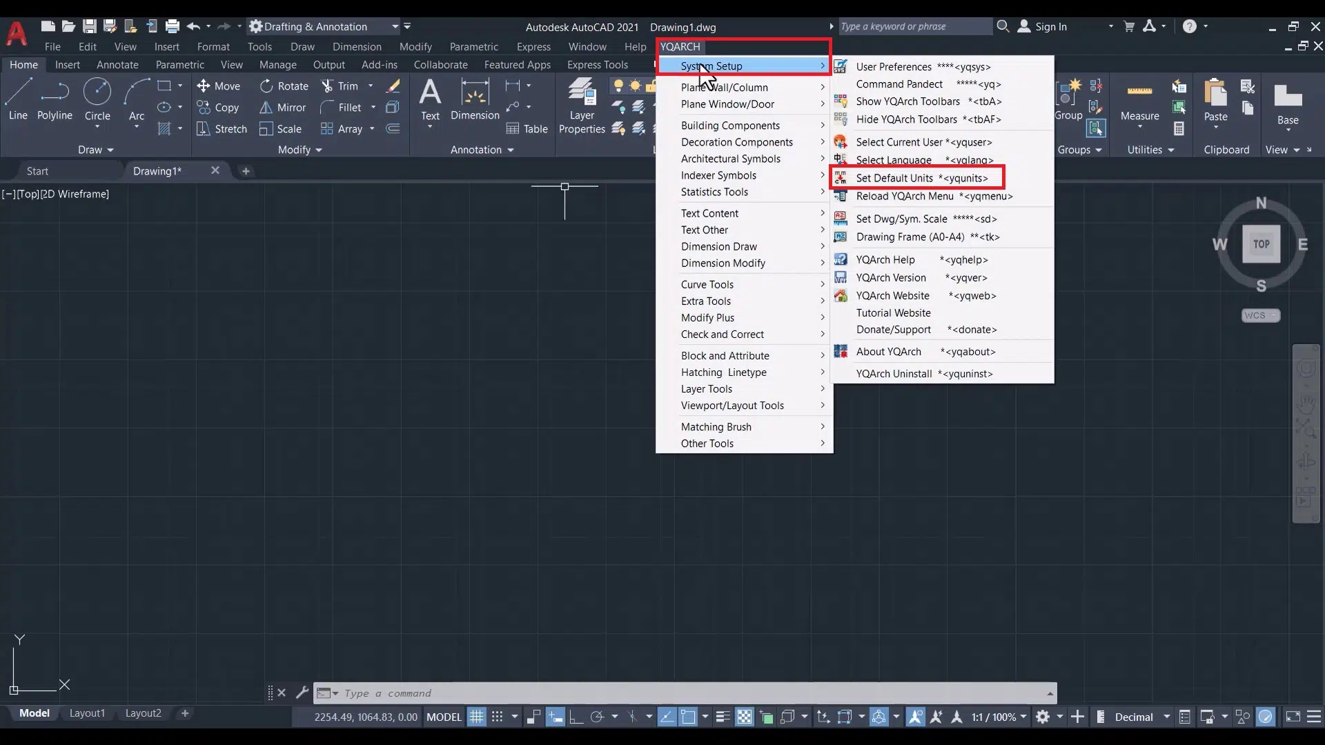 نکته بسیار مهم در کار با این پلاگین هماهنگی واحد اندازه گیری اتوکد با پلاگین است. برای تنظیم واحد اندازه گیری پلاگین YQArch کافی است در قسمت system setup گزینه set default unit را انتخاب کنید و واحد را متناسب با واحد اتوکد انتخاب کنید.