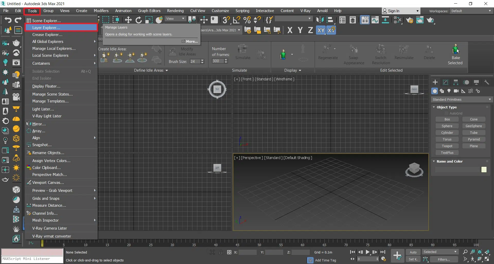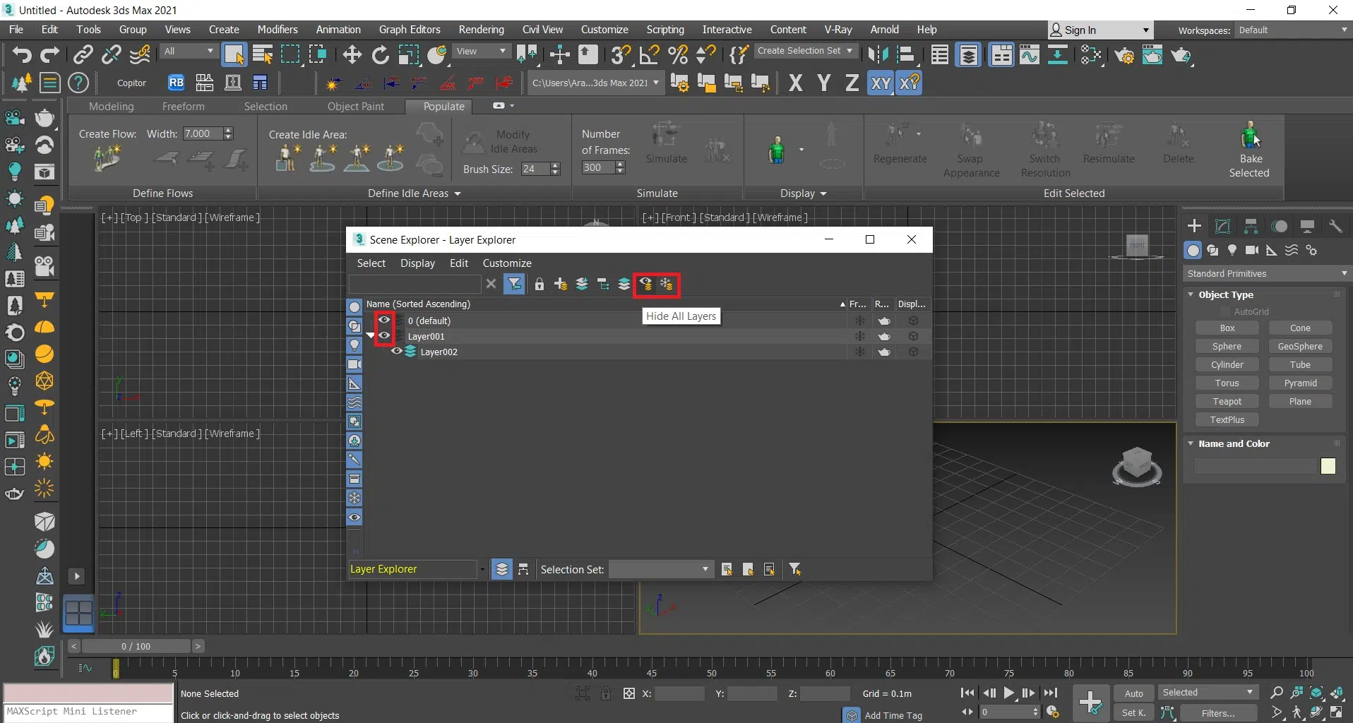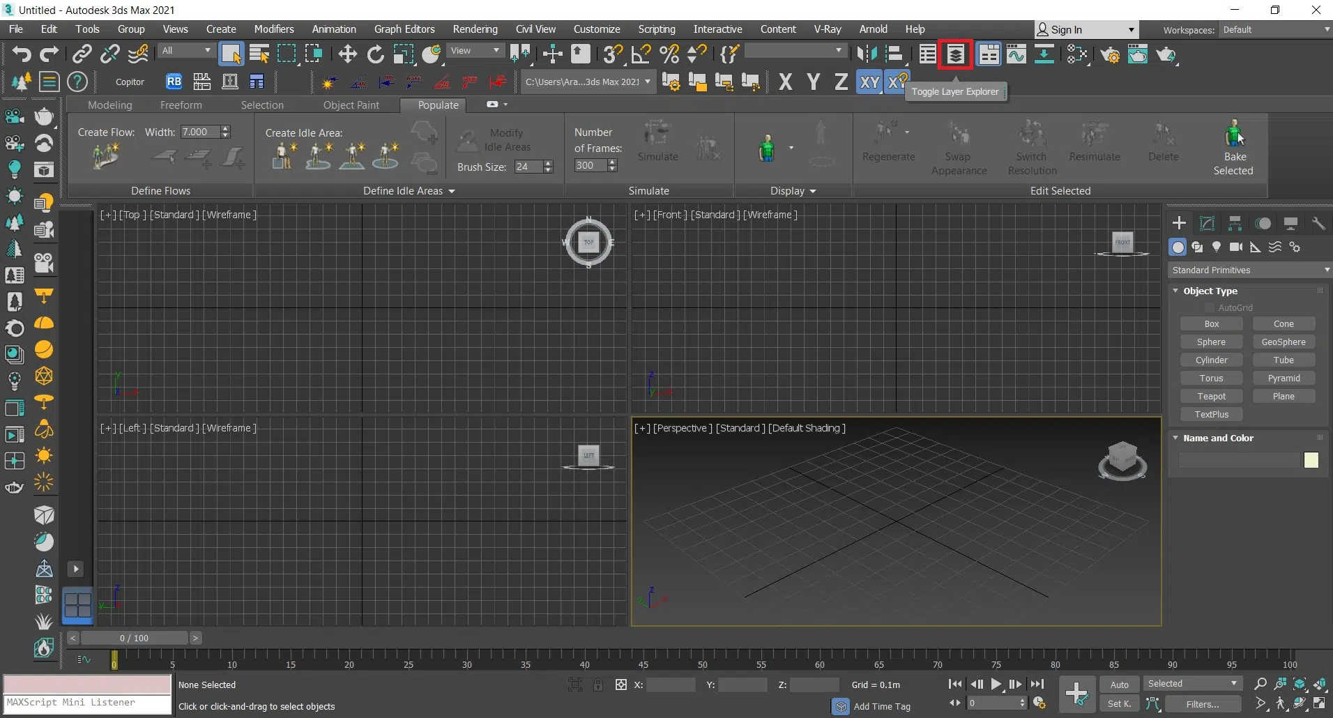 برای لایه بندی ترسیمات در تری دی مکس میتوانید در نوار ابزار بالای تری دی مکس روی Toggle layer explorer کلیک کنید تا پنجره لایه ها برای شما باز شود.