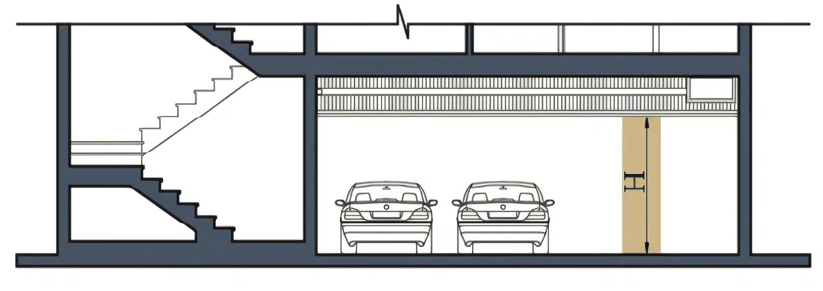 - ورودی پارکینگ باید در محلی پیش بینی شود که ارتفاع آن، از کف تمام شده تا زیر سقف حداقل ۱/۸۰متر باشد.
