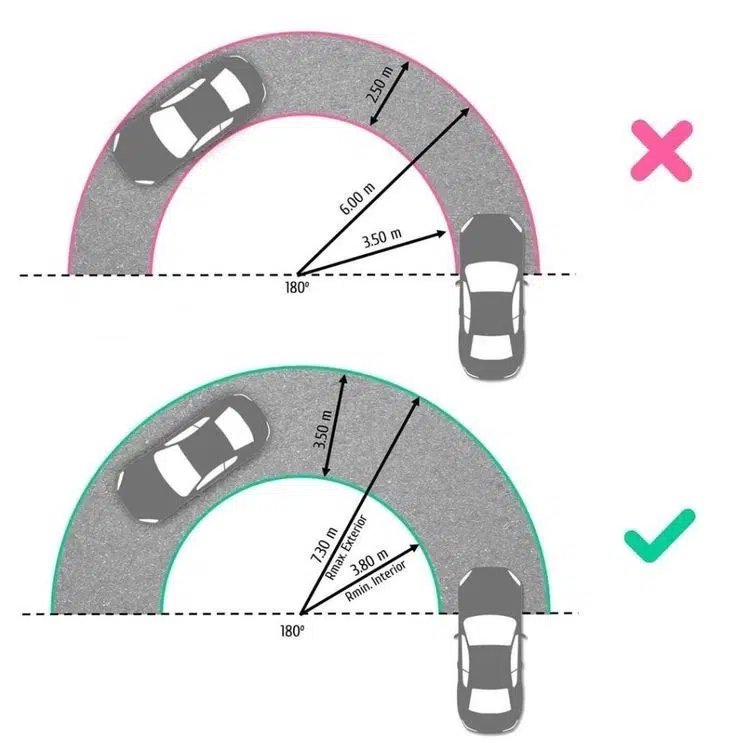 در ضوابط طراحی پارکینگ باید ورود و خروج اتومبیلها از آن، مسیر عبور و مرور و گردش اتومبیل در شرایطی که تمام اتومبیلها در محل پارکینگهای خود جای گرفتهاند به سهولت انجام گیرد. به این منظور، حداقل شعاع گردش یا طول مورد نیاز جهت مانور اتومبیل ۵متر، و حداقل شعاع داخلی در مسیر گردش پارکینگها ۴/۵۷متر در نظر گرفته شود.