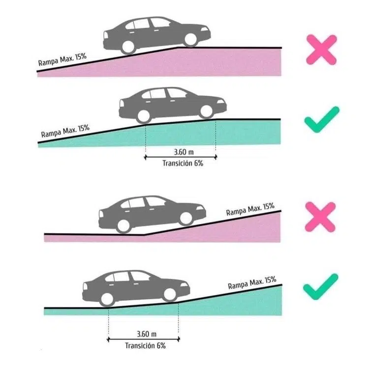 - حداکثر شیب رمپ پارکینگ ۱۵درصد میباشد. ولی در یک متر ابتدایی و انتهایی از رمپ، حداکثر شیب باید ۱۰درصد یا کمتر باشد.