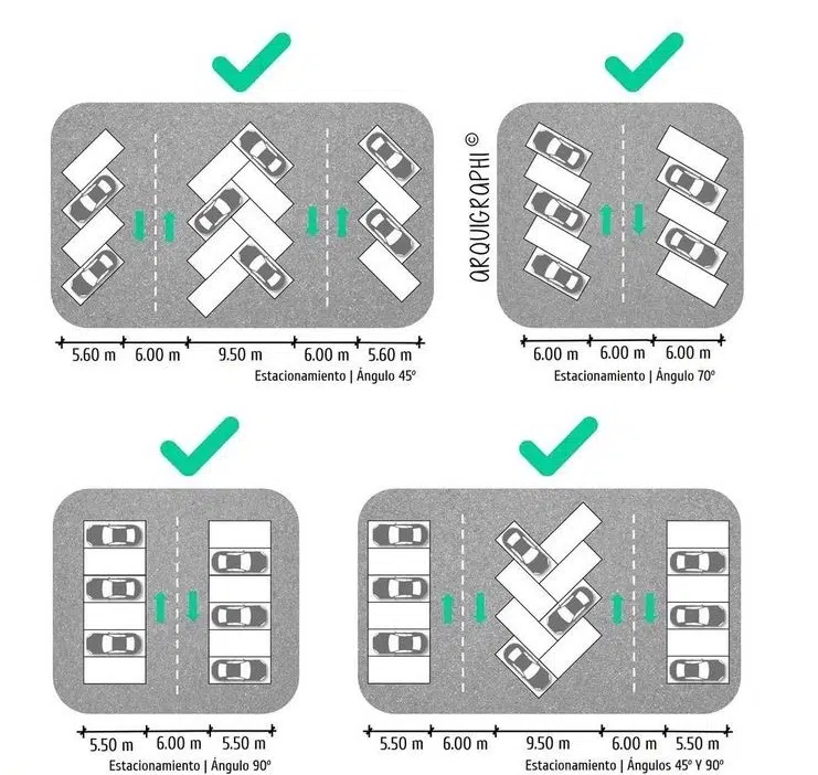 فاصله آکس تا آکس ستون برای یک ماشین 3 متر، دو ماشین 5 متر و سه ماشین 7 متر در نظر گرفته میشود. طول فضا نیز 5 متر باید باشد و فضای پشت ماشن برای گردش نیز 5 متر است. اگر جلوی محل پارک خودرو درب انباری قرار دارد باید حداقل 60 سانتی متر فضا برای عبور و مرور در نظر گرفته شود. در پارکینگ معلولین دهانه توقفگاه خودرو به عرض ۳٫۵۰ متر می باشد.