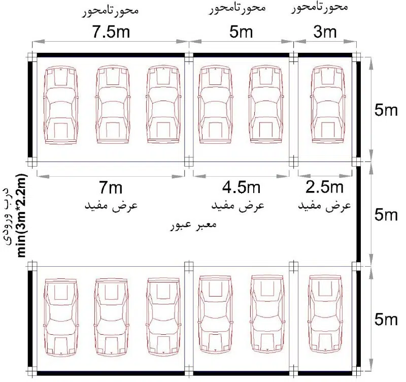 - ارتفاع مفيد مجاز پاركينگ های كوچک حداقل 220 سانتی متر میباشد.