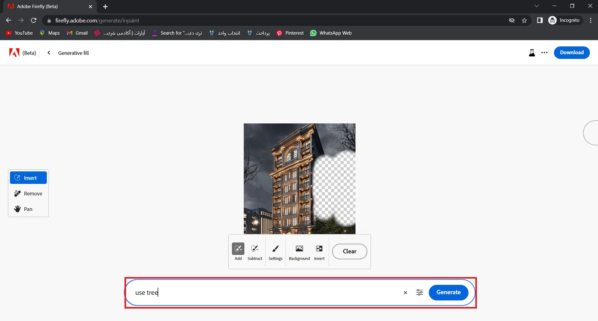 در نهایت به کمک براش قسمتی را که میخواهیم تغییر دهیم انتخاب میکنیم و در قسمت مربوطه به صورت نوشتاری موردی که میخواهیم جایگرین کنیم را تایپ میکنیم و به کمک گزینه generate میتوانیم عکس ادیت شده را با چند ایده متفاوت دریافت کنیم..