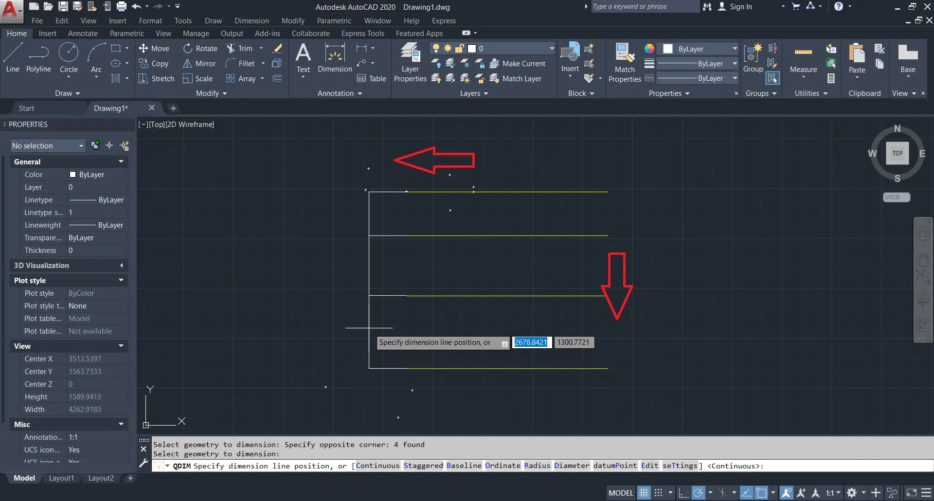 سپس خطوط مورد نظر را انتخاب میکنیم و اینتر را میزنیم. حال اگر موس را به سمت چپ ببریم فاصله عمودی را به ما نشان میدهد و اگر به سمت پایین موس را حرکت دهیم فاصله افقی مشخص میشود. به همین سادگی میتوانیم فاصله ها را در سریعترین زمان ممکن در اتوکد اندازه گذاری کنیم.