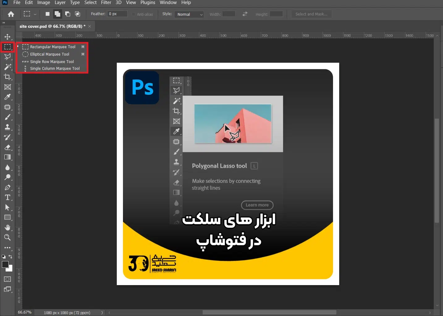 اولین ابزار Rectangular marquee tool است که چهار حالت مختلف دارد و با کلیک راست روی آن میتوانید حالت مورد نظر خود را انتخاب کنید. حالت اول آن برای سلکت کردن در حالت مستطیل یا مربع است که برای استفاده از حالت مربع باید همزمان shift را نگه دارید. حالت دوم هم برای انتخاب کردن در حالت بیضی و دایره است که برای سلکت در حالت دایره نیز باید shift را نگه دارید. دو حالت آخر هم برای انتخاب ستون های عمودی و افقی میباشد.