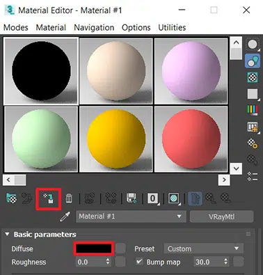 ابتدا یک متریال خام به آبجکت مورد نظر اعمال میکنیم. سپس diffuse آن را روی مشکی قرار میدهیم.