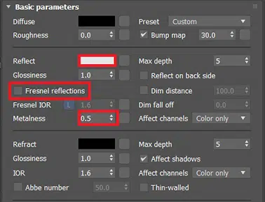 reflect را روی رنگ روشن تنظیم میکنیم و تیک fresnel را برمیداریم. همچنین metalness را روی 0/5 تنظیم میکنیم. برای تیره تر شدن آن میتوانیم reflect را تیره تر کنیم.