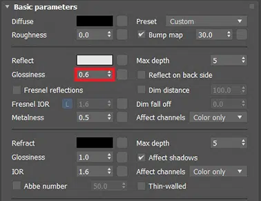 در ادامه برای ساخت استیل مات همان روند بالا را ادامه میدهیم و فقط شدت glossiness را کم میکنیم تا به تنیجه مناسب برسیم.