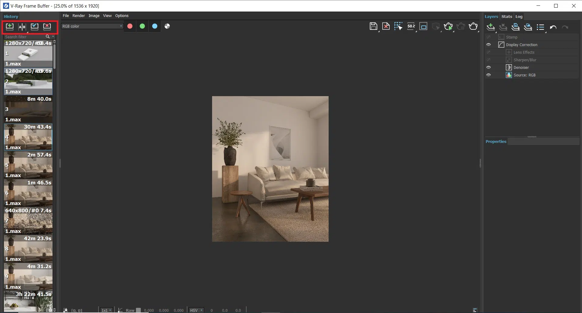 از قابلیت های هیستوری میتوان به امکان سیو رندر ها و مقایسه آن ها با هم اشاره کرد که به بهبود رندر های ما کمک زیادی میکند. علامت + برای اضافه کردن رندر به history میباشد. برای مقایسه رندر نیز ابتدا به کمک A/B میتوانید تعداد مقایسه های خود را مشخص کنید که تا 4 رندر امکان پذیر است. سپس با کلیک روی رندر ها میتوانید مقایسه را انجام دهید. علامت تیک و ضربدر هم برای انتخاب یا حذف رندر از فریم بافر میباشد.