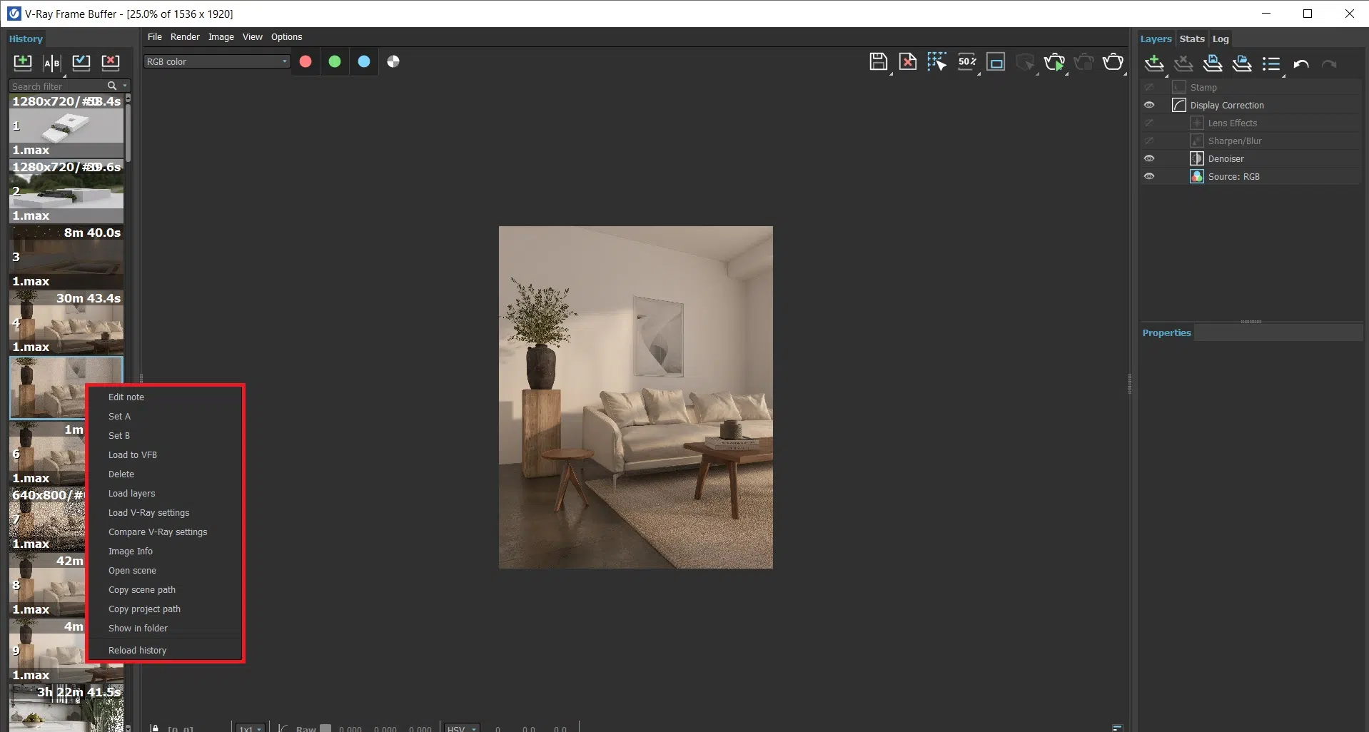 اگر روی رندر های سیو شده در هیستوری کلیک راست کنید پنجره ای باز میشود که میتوانید تنظیمات را برای آن اعمال کنید. به طور مثال میتوانید یادداشتی بنویسید یا آن را برای حالت مقایسه قرار دهید. مهم ترین و بهرین گزینه این قسمت Load Vray setting و Open Scene است که به کمک آن میتوانید تنظیمات رندر مورد نظر را در یک صحنه دیگر استفاده کنید و یا فایل مکس مربوط به آن صحنه را باز کنید.